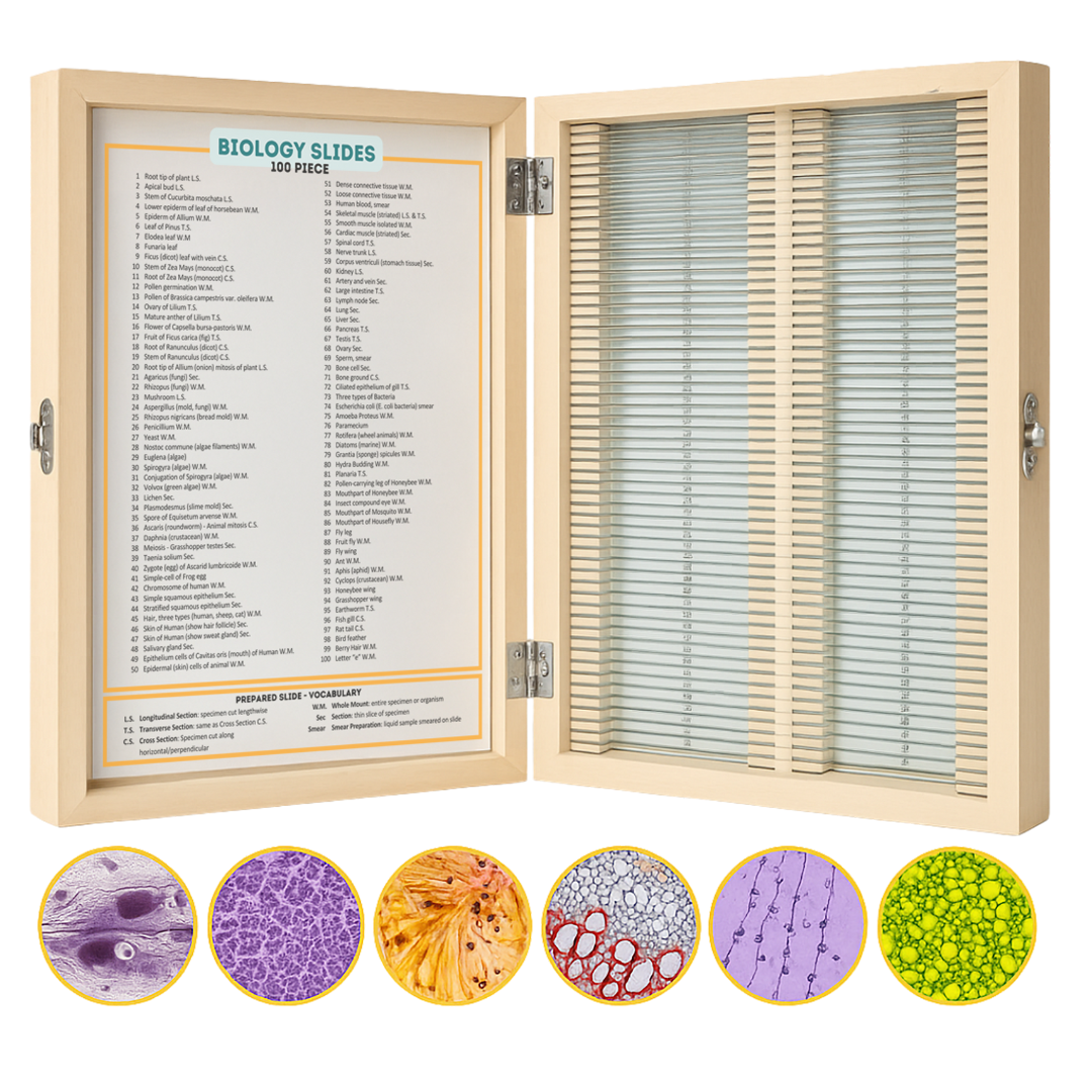 Step into the microscopic universe with our 100-Piece Biology Slide Collection, a beautifully curated set that brings the wonders of life right to your microscope. Our family has spent countless afternoons exploring these slides together β from the delicate structure of butterfly wings to the intricate cells of plant stems β and every time, it sparks new curiosity and excitement for science. Whether youβre homeschooling, teaching, or just love to explore, this collection turns every viewing into a discovery.