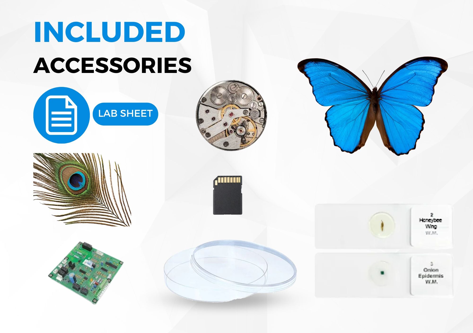 Experience Pack – Your microscope will come with its experience pack that includes petri dish, butterfly or beetle, peacock feather, watch part, micro-SD card, and quick-start activities.