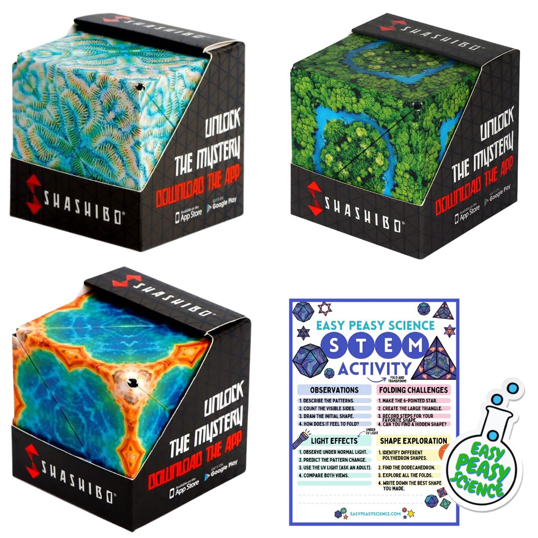 By combining the Earth, Jungle, and Undersea Shashibo Cubes, this bundle allows builders to explore shape transformations, connect cubes together, and experiment with larger geometric structures. Easy Peasy Science also includes a bonus hands-on STEM activity to extend the learning and discovery even further.