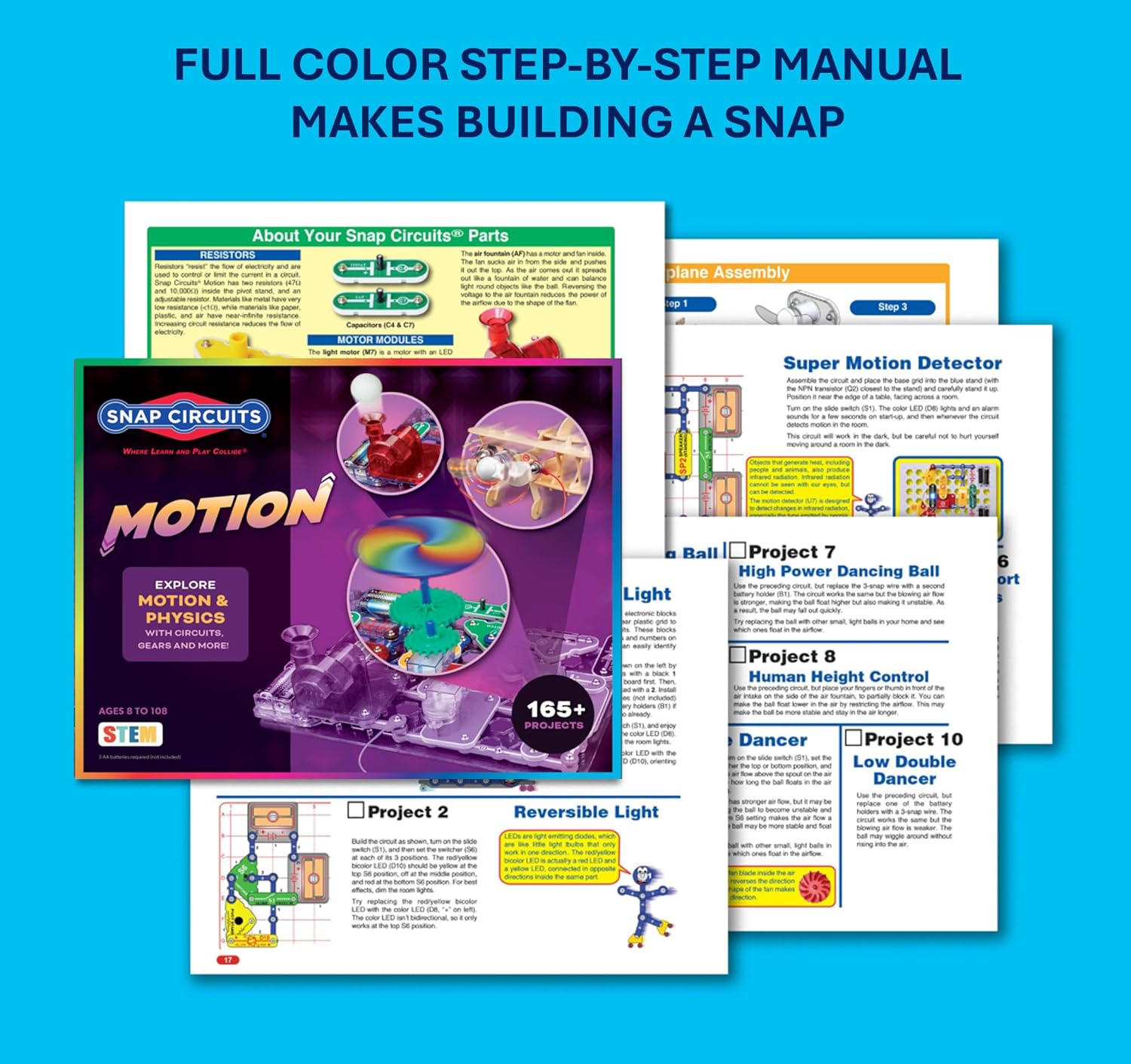 Bring physics to life—add the Snap Circuits® Motion Electronics Discovery Kit to your cart and start building, testing, and discovering today!