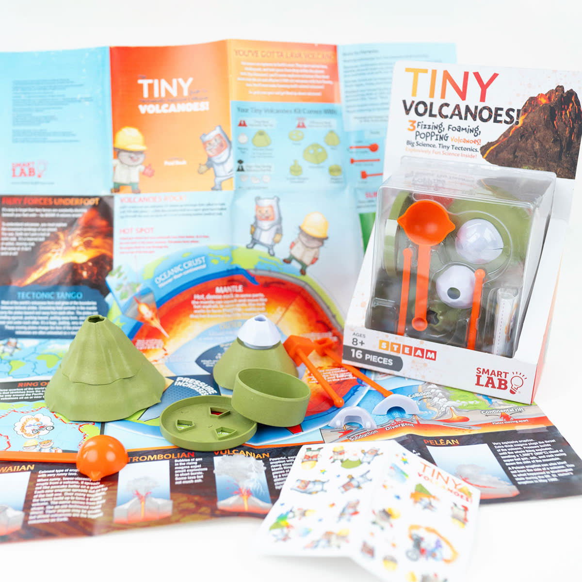 16-piece Tiny Volcano Kit Includes: Tiny Red Volcano, Pop-Top Gray Volcano, Effusive Red Volcano, tools, and bonus volcano stickers for an extra burst of fun! Recommended for ages 8+.